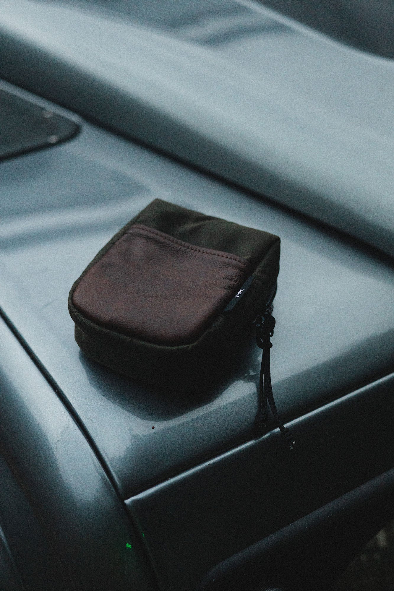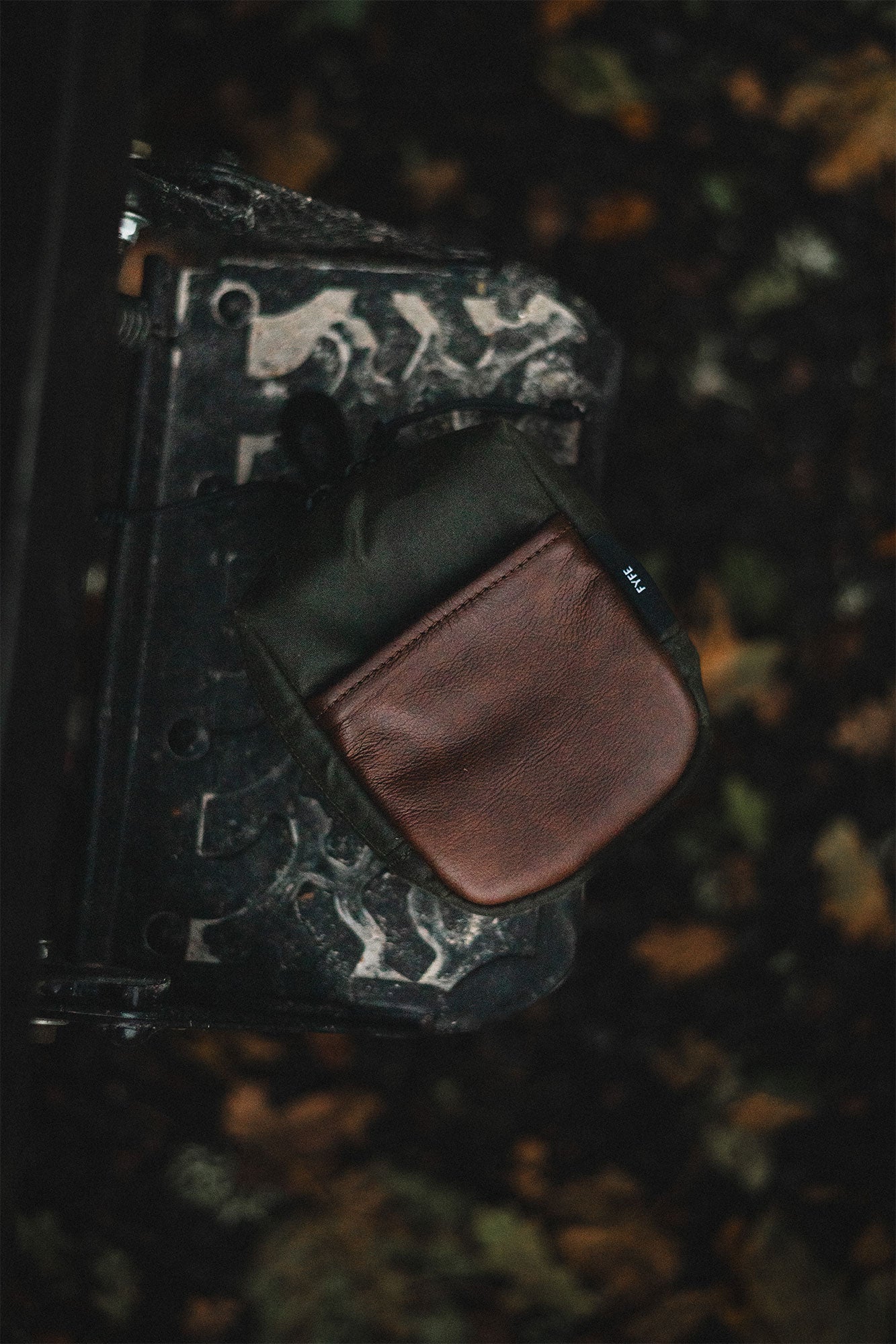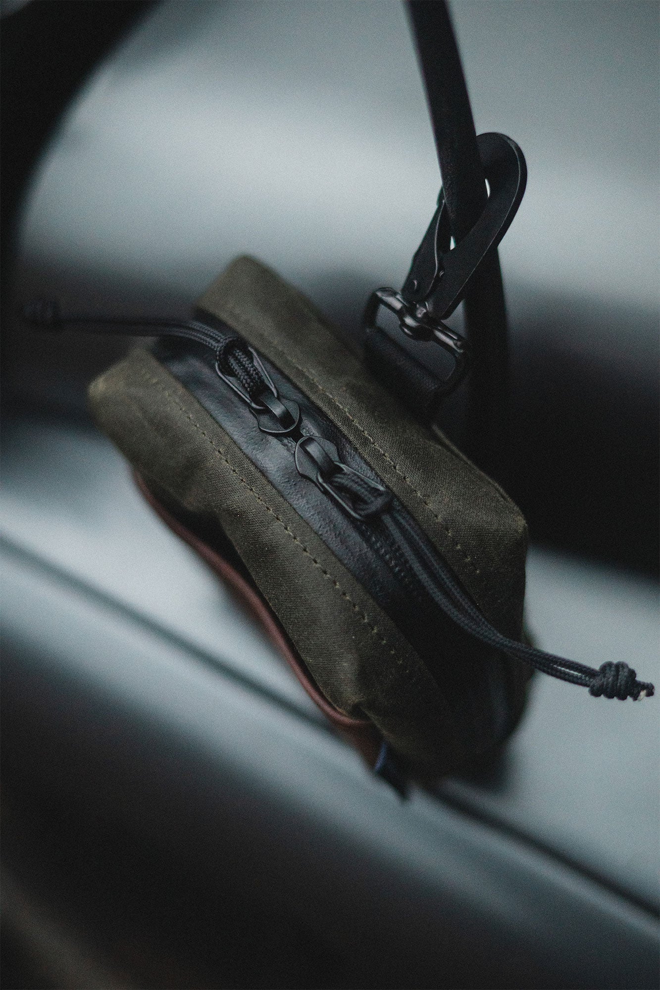Inside, a space mesh lining offers added cushioning and breathability. The case features a Two-Way Waterproof YKK™ Zipper with 275 paracord pulls, a matte black brass swivel hook for secure attachment, and ¾” nylon utility webbing. A dark brown leather front pocket adds a touch of texture and practical storage.