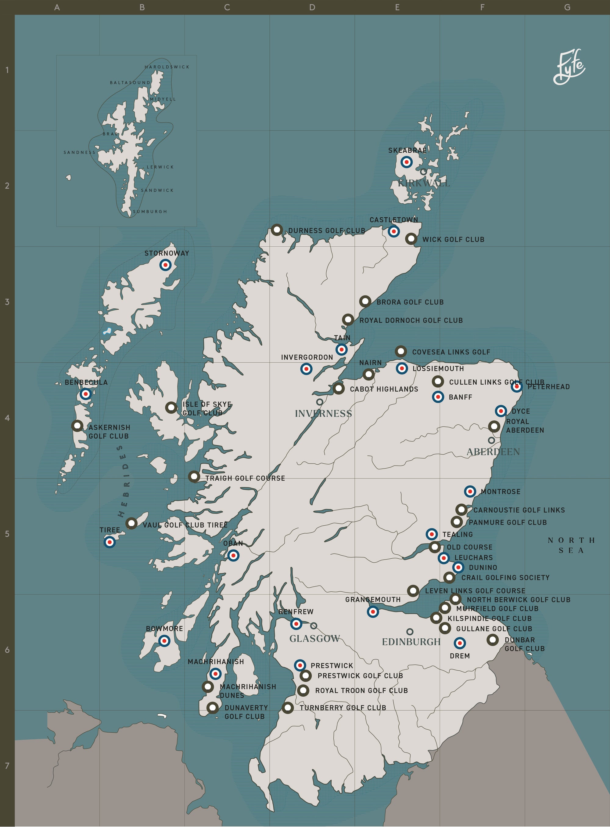A map of Scotland’s coastline, tracing the overlap between historic RAF airfields and golf courses—land shaped by wind, purpose, and quiet precision.